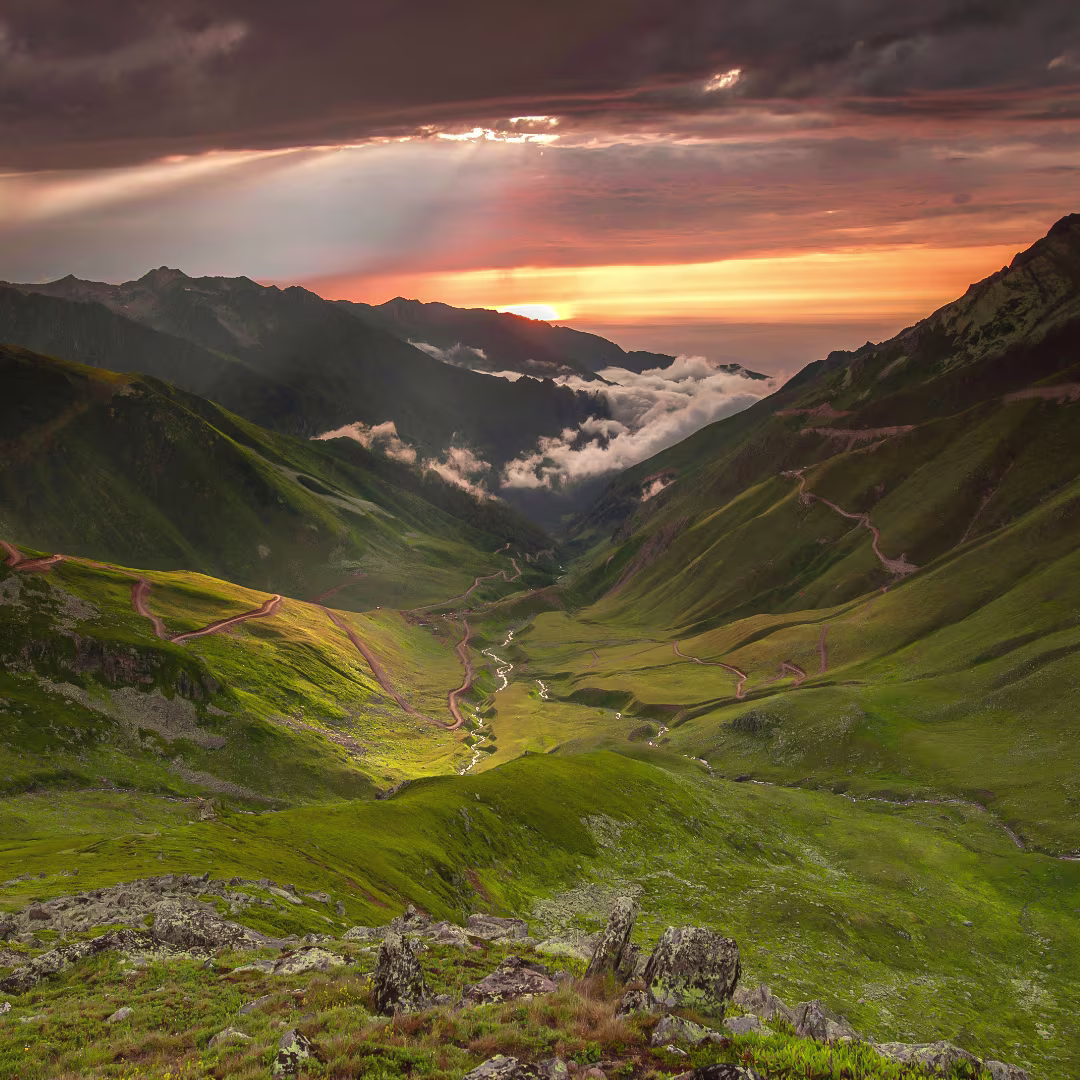 Spektakuläre Sonnenuntergänge über dem Atlantik von den höchsten Graten des Tals aus beobachtet.